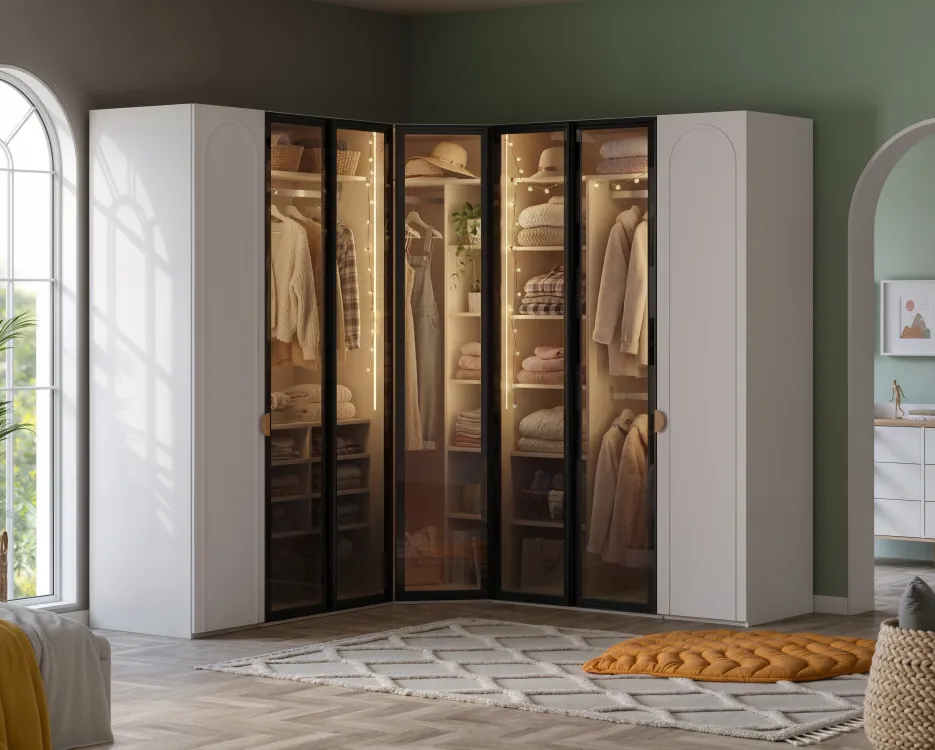 Morgens zwischen dunklen Regalfächern nach Kleidung zu suchen und dabei ordentlich gefaltete Sachen durcheinanderzubringen kostet Zeit und zerstört schnell die Ordnung im Schrank. Die transparenten Glastüren in der Mitte, kombiniert mit einem LED-Beleuchtungssystem, ermöglichen es Jugendlichen, das Gesuchte auf einen Blick zu finden – sogar ohne die Tür zu öffnen. Dieses moderne, beleuchtete Kleiderschrankdesign schafft die Atmosphäre einer stilvollen Boutique, beschleunigt die Morgenroutine und verleiht dem Zimmer gleichzeitig eine dynamische Ausstrahlung.