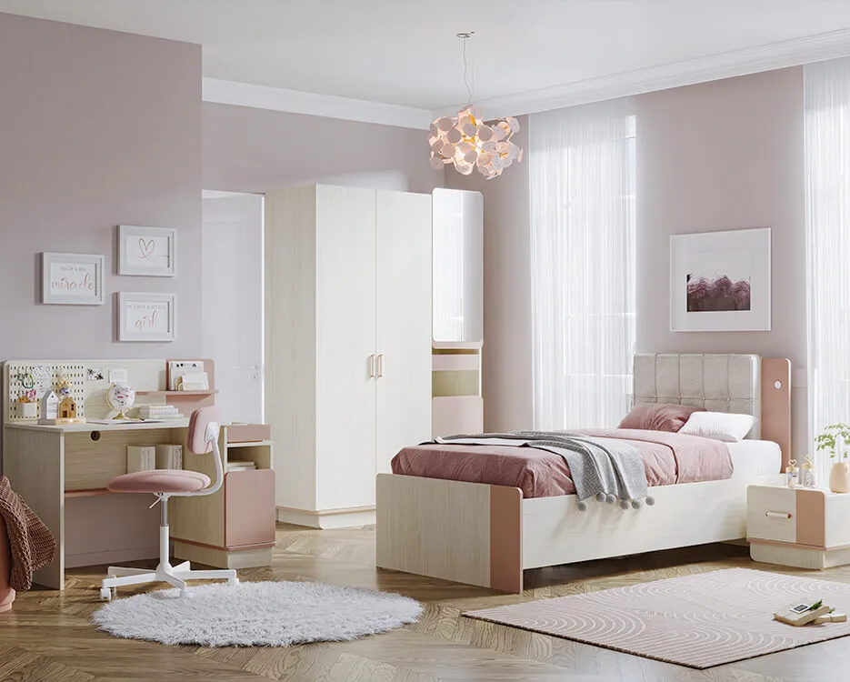 Harmony Genç Odası, pastel ve doğal tonların eşsiz sıcaklığını, renk geçişleriyle öne çıkan tasarımıyla uyumlu bir atmosfere dönüştürüyor. Gençlerin hareketli yaşamlarından ilham alan huzurlu ve düzenli bir yaşam alanı oluştururken, her detayında farklı bir konfor ve işlevsellik vadediyor. Oval formlarla tamamlanan tasarım çizgisiyle, birçok fonksiyonel özelliği bir araya getiren özgün bir kimliğe kavuşuyor.