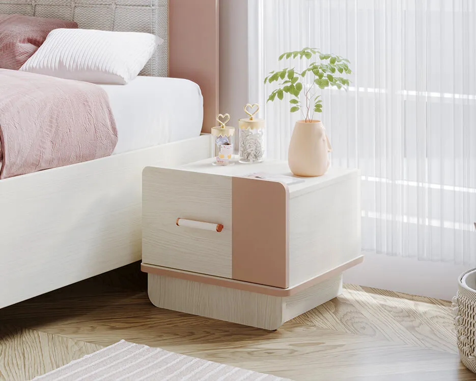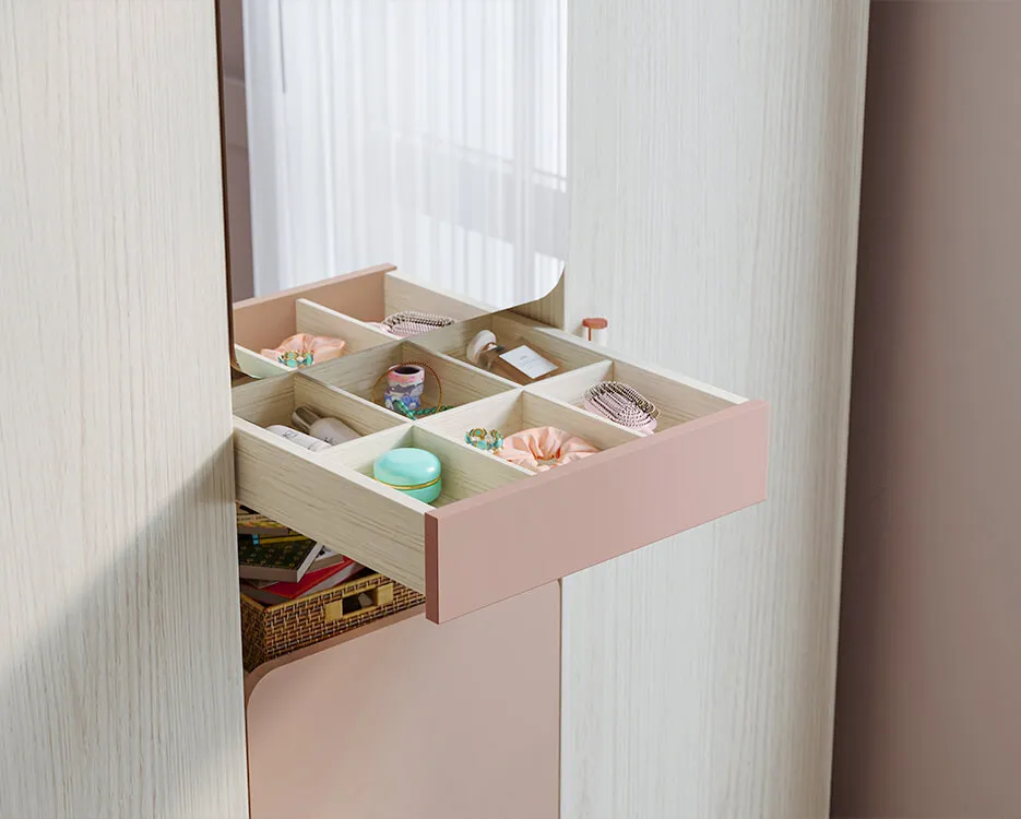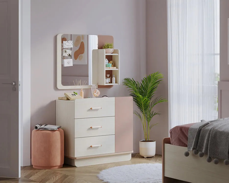 Harmony’nin en güzel yanlarından biri, kişiselleştirilebilir aksesuar alanları. Komodin, puflu raf sistemi, duvar rafları gibi detaylarla gençlerin odasını kendi tarzlarına uygun şekilde düzenlemesine olanak tanıyor. Aynalı makyaj modülü hem depolama hem de dekoratif bir şıklık sağlıyor.